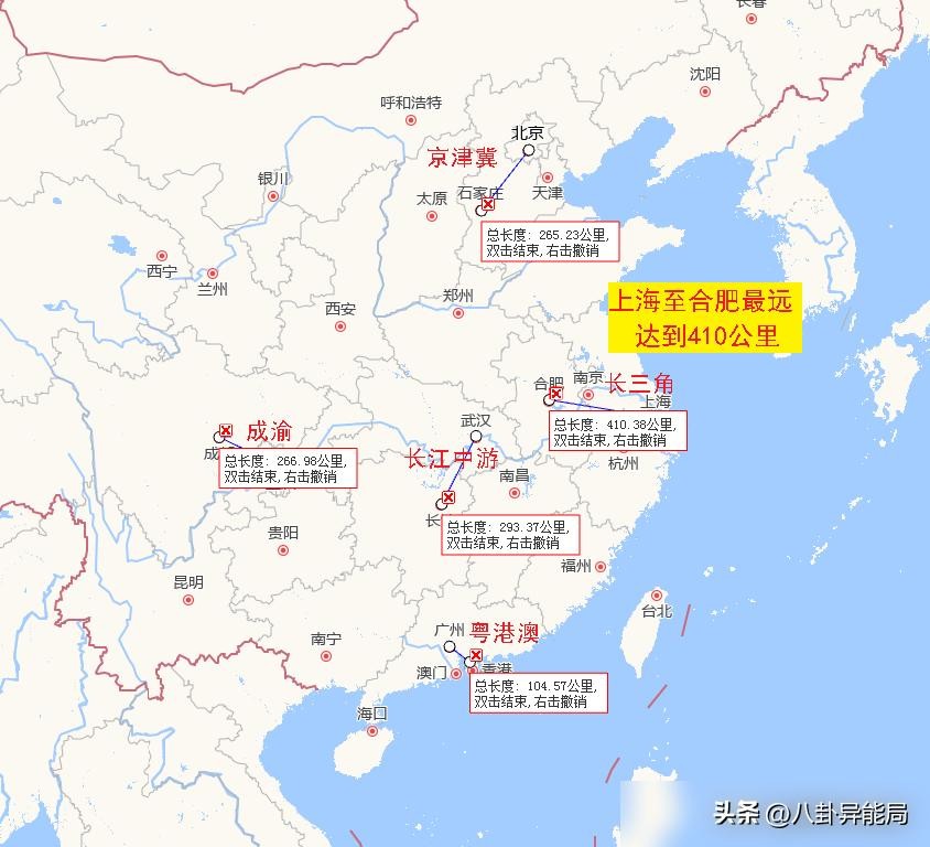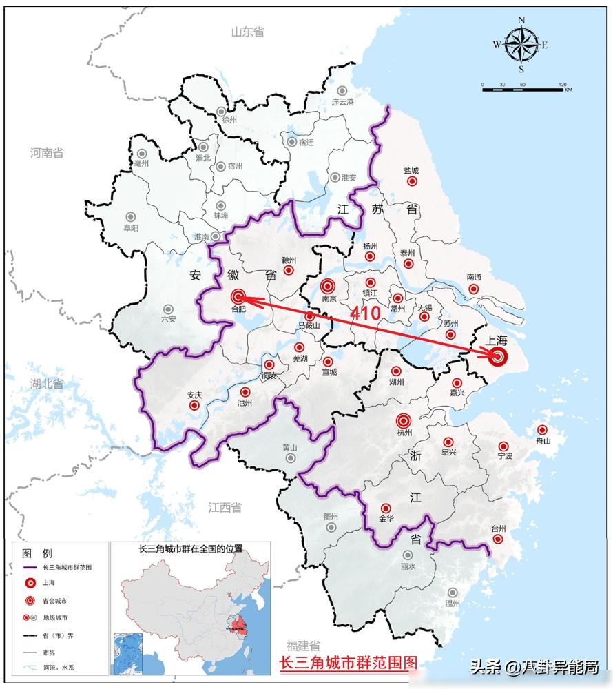 在长三角城市群内,中心城市上海的城市位置与该城市群最边远的合肥之间的直线距离达到了410公里。