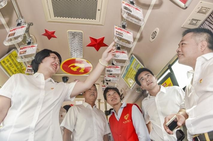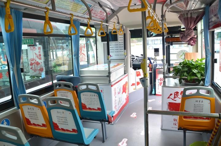 红色文化:营运三公司受“不忘初心,牢记使命”主题教育启发,将公交车厢作为载体,开展“铭记革命历史,传承红色精神”的宣传活动,将公交车打造成流动的红色教育基地。通过这一特殊载体,进一步增强乘客的国防意识,增加市民国防知识。车厢内图文介绍诸如“南昌起义”“长征精神”“延安精神”“红船精神”等革命精神,抄录有叶挺的《囚歌》、文天祥的《过零丁洋》《我骄傲,我是中国人》等正能量满满的诗词,让乘客在乘坐公交车的同时感受红色文化,接受红色教育的洗礼。