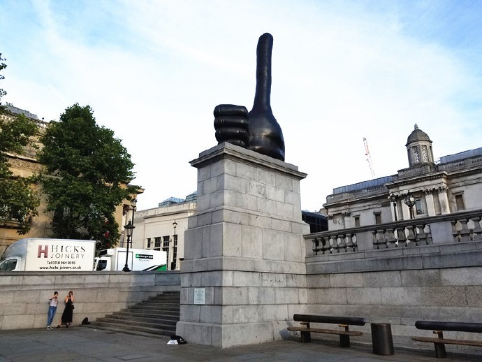 西北角的"第四基座"一直空缺着,近年来,伦敦市政府在此轮流置放现代雕塑作品。眼下放置的是一个名为《Really Good》的青铜雕塑,就是一只竖起的大拇指。really good翻译过来就是:真的好,用网络语言来翻译可能更贴切:点赞!