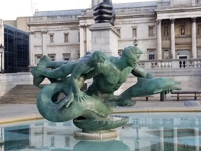 广场上还有左右两个花形喷水池,池中有青铜雕像。广场过去鸽子很多,所以也有"白鸽广场"之称,昨晚吃饭时餐厅服务员提到这个广场也称"白鸽广场"。但现在已经看不到鸽子,这是因为大量的鸽子带来公共卫生问题,前些年伦敦政府开始采取措施赶走鸽群,包括禁止在广场上喂食鸽子,如今广场上的鸽子已基本绝迹。