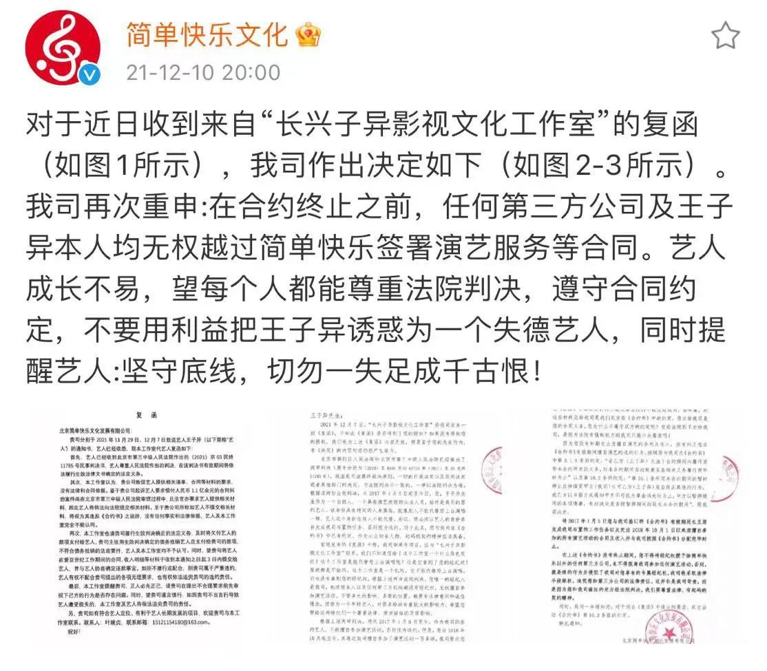 王子异和简单快乐公司解约败诉新闻频上热搜,了解简单快乐的人都知道,李荣浩也曾经是简单快乐公司的艺人,带红李荣浩的的李白、模特都是出自于简单快乐公司,旗下也有许多即使你不知道名字,也一定听过他的歌的优秀歌手,让简单快乐再一次出现在大众眼里,便是王子异于公司发出“解约函”后两次对付公堂最终败诉的新闻,这一结果引发了大量粉丝的不满,铺天盖地的辱骂冲向了简单快乐公司微博。