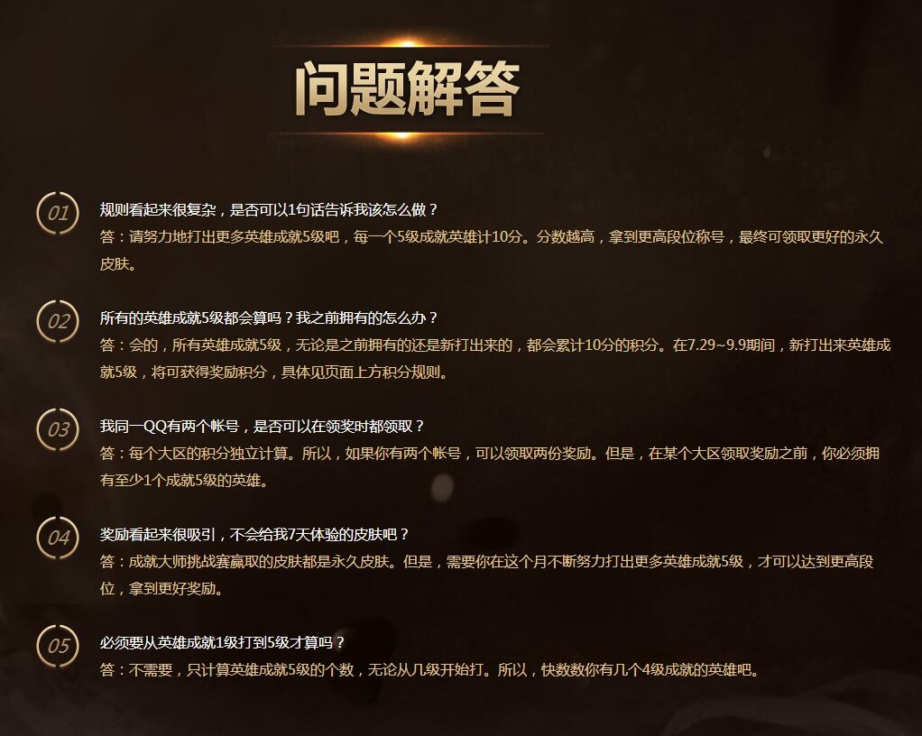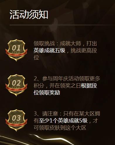 很简单,就是通过解锁英雄成就五级,注意哦,这里也包括已经解锁的,参加五周年相关活动,你就可以获得相关积分。不同的成就积分可以对应不同的成就段位。在活动结束后,你可以免费获得对应奖池中的永久皮肤一个。活动时间为:2016年7月29日-2016年9月9日。
