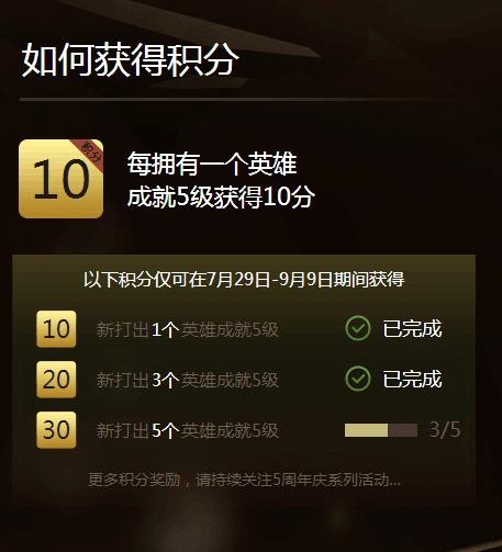 积分的获取主要来源于解锁英雄成就五级,每个10分。在活动期间解锁会有额外积分奖励,参与五周年系列活动也可能获得积分。比如你现在有4个成就五级的英雄,在活动期间又成就了5个五级英雄,你就获得了9个成就五级的英雄90分,外加60分的积分奖励,共计积分为150分。