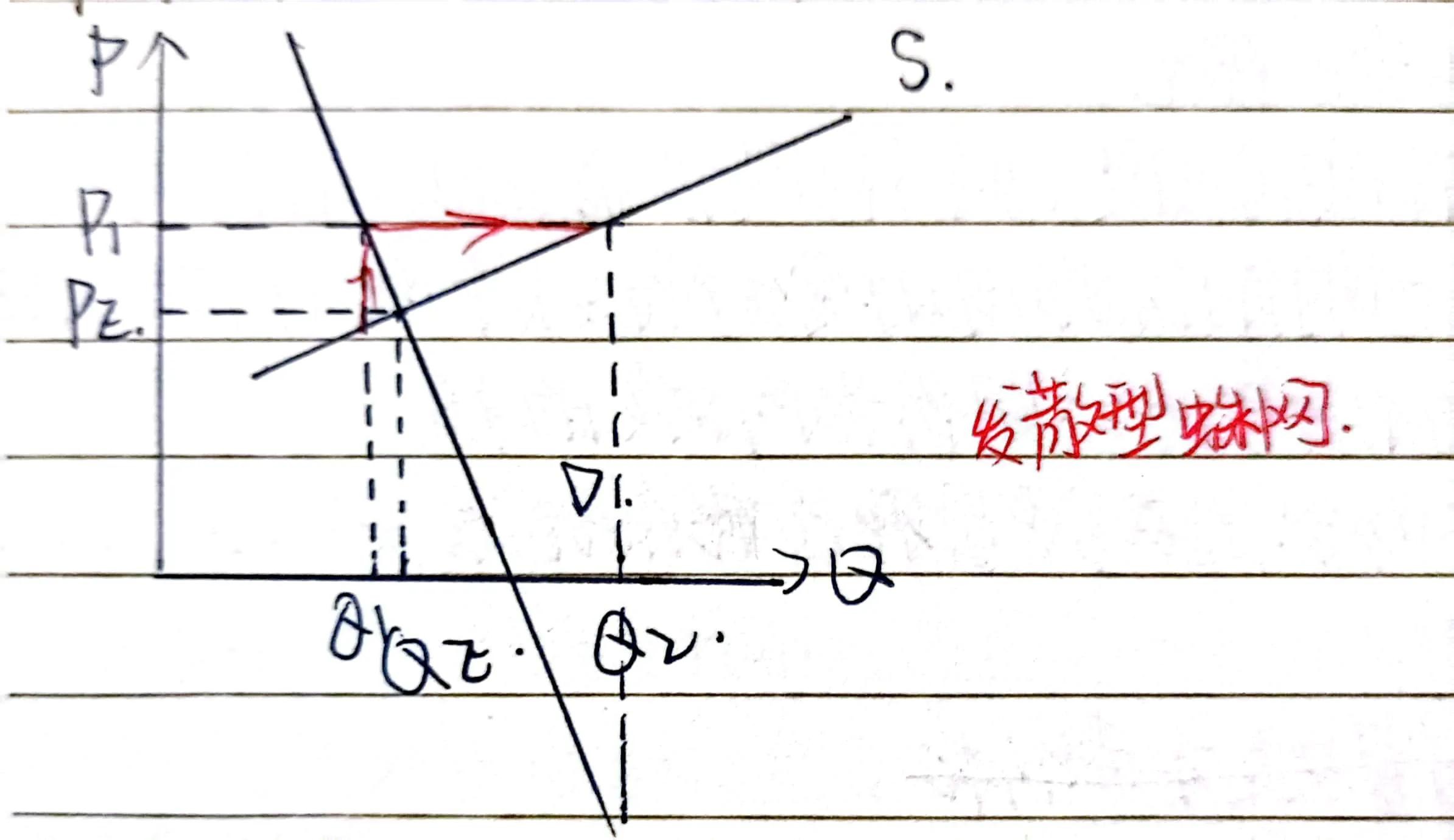 对于Q轴,供给曲线斜率绝对值<需求曲线斜率绝对值,即供给弹性>需求弹性。外力干扰偏离原均衡后,实际价格和实际产量波动幅度越来越大,偏离均衡点越来越远。