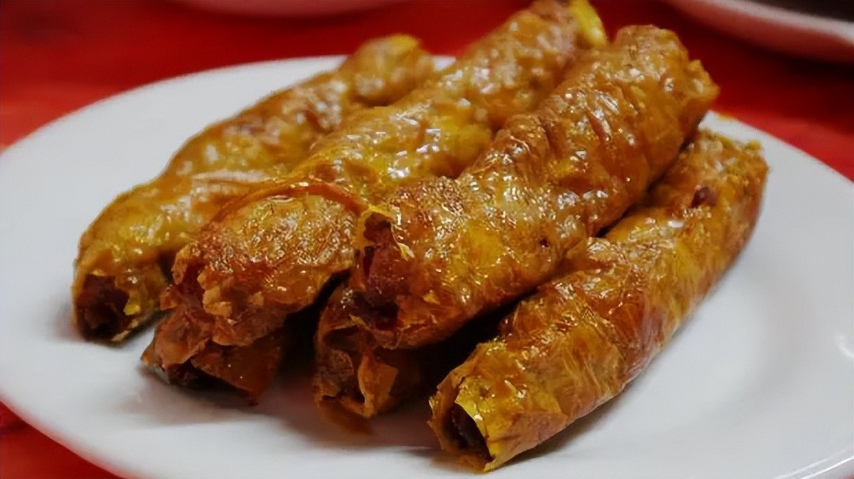 炸五香:是用炸氽法制作的地方传统小吃。炸五香以五花肉、马蹄、豆皮、洋葱等食材为主要原料,经过油炸烹饪而成。它的外观呈褐色长条状,肉馅肥瘦相间,吃起来外焦里嫩,鲜香酥脆。
