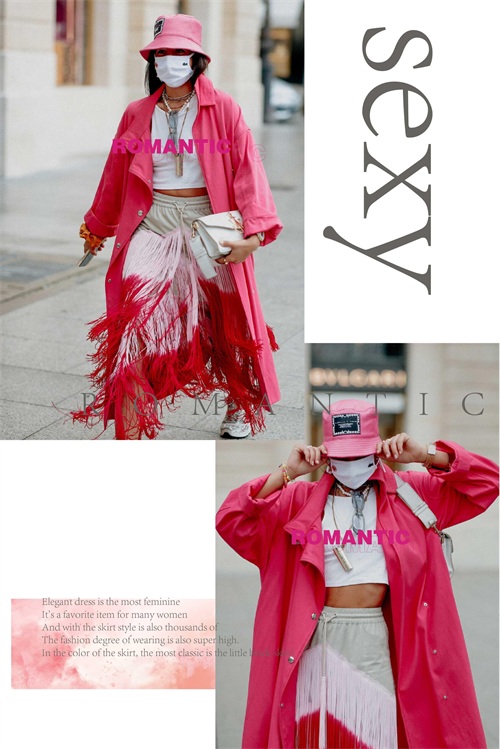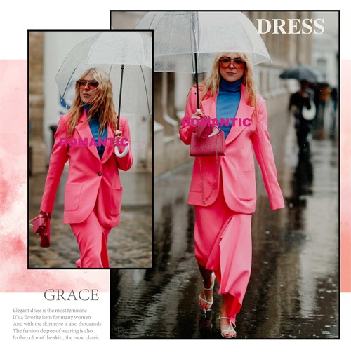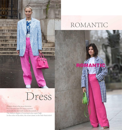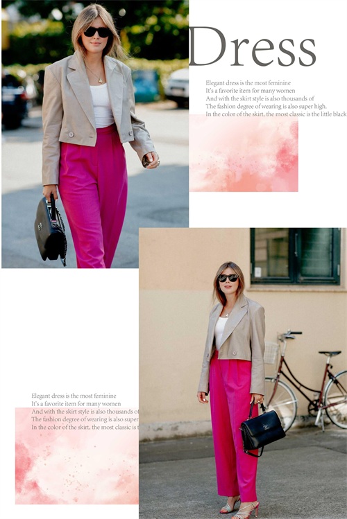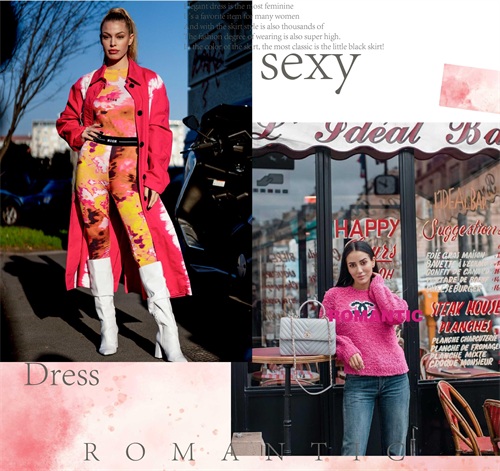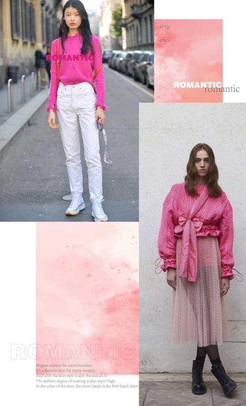 玫红色的单品与淡色系的单品相互的组合起来,显现出层次上面的不同视觉感受,或是深浅或是明暗的色系晕染,都将不一样的潮流韵味体现。