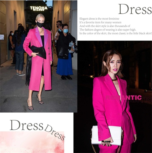 玫红色的色彩,是比较鲜亮的色系,上身会显露出很浓郁的年轻感觉。即便是成熟的大龄女子们,也是可以驾驭起来,视觉上面也不会担心给人装嫩的嫌疑。