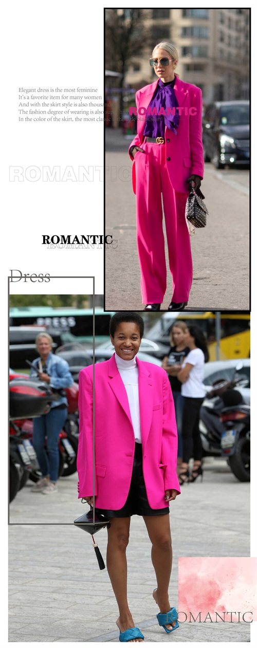 大气简洁的西装造型,时尚优雅,带着正式感,彰显出利落与帅气风范呈现。而采用玫红色来加持,会把西装的正式感减弱一些,带来一些甜美优雅的淑女风情。