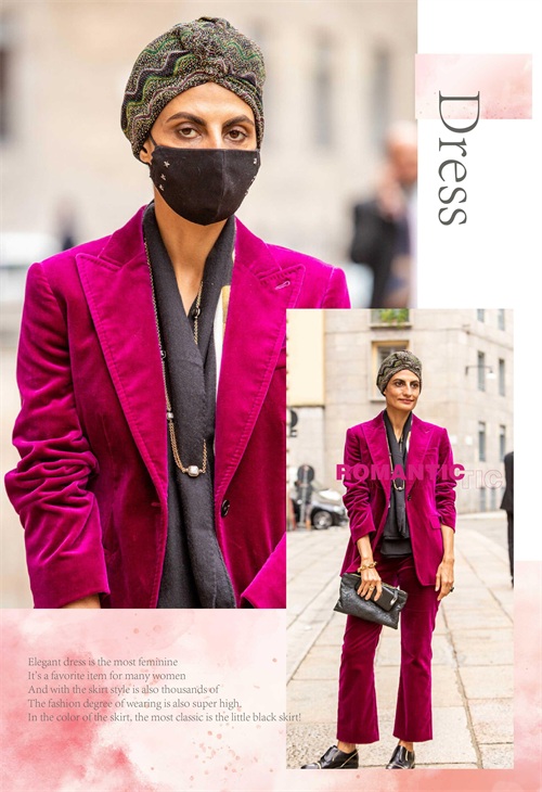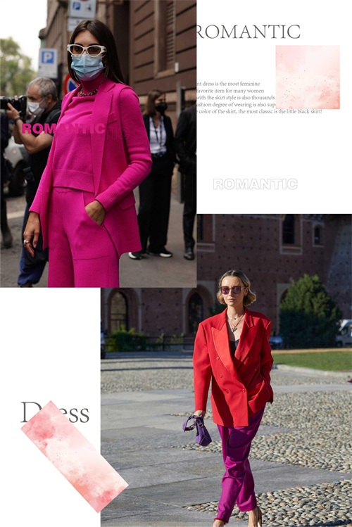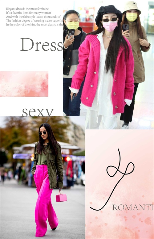 玫红色的单品自身就带有一定的辨识感,而在与其它单品的色系选择上面,可搭配一些比较迷人的色泽,时尚而又显得时髦抢眼。