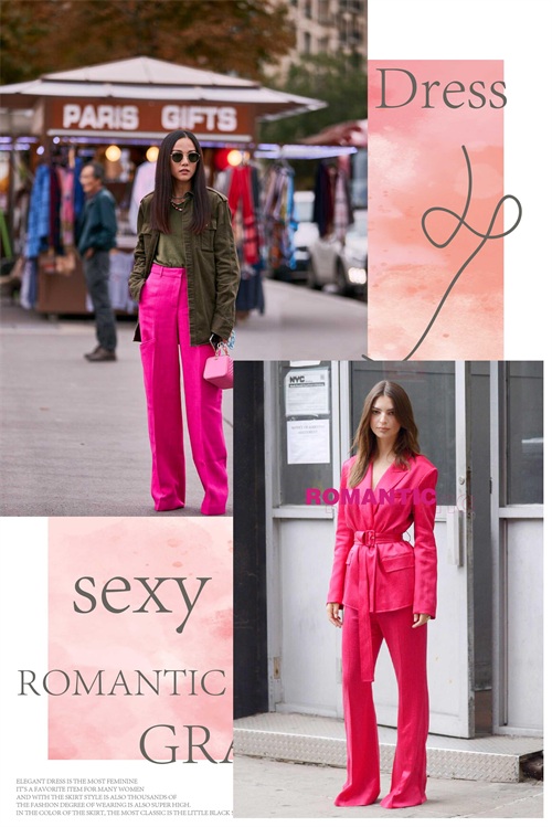 玫红色的西裤造型,色系亮度颇高,打造出非同寻常的视觉体验感。而且靓丽十足的色彩,即便是在滚滚人潮里,也能够成为吸睛焦点,打造出醒目的视觉感受。