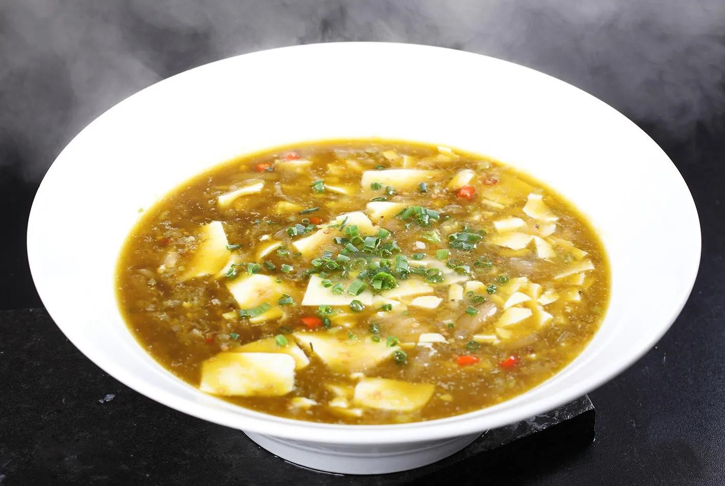 牛清汤地道的滋味只在浦江能吃到,现杀的活牛,切肉剔骨后,将筋骨皮肉与内里放入大桶锅里,任其炖上一天,高汤的锅里,加入牛血豆腐,客人来了,现盛一碗热气腾腾的牛清汤,汤汁明黄鲜亮,看似纯澈喝起浓郁,小四方片的牛血软滑可口,丝丝热辣直暖心扉。