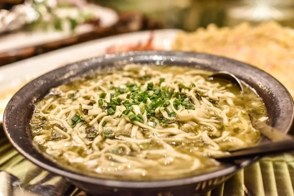 早些年,在东阳民间,人们舍不得把吃剩下的剩菜汤倒掉,在下一顿煮面条时全倒进锅里,各种风味掺杂在一起,既好吃易消化,又营养丰富。如今,佐以新鲜的青菜、蛋丝、肚片、河虾、黑木耳、蘑菇等,经精心改良,已登上大雅之堂。