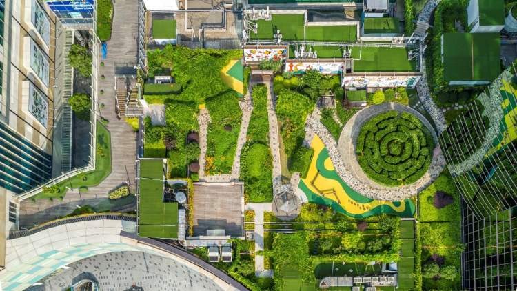 C栋办公楼外的生境花园及商场顶楼的绿色都市农场——丰尚小农庄,为写字楼的白领们提供了办公之余进行休憩放松的自然空间,惬意松弛的“可呼吸”办公环境,让办公效率大幅提升>