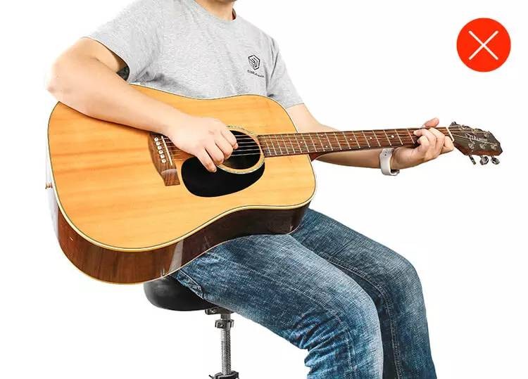 首先,你应该要用自己最舒服的姿势坐下来啦!如果你是右手弹奏,则左手要轻松的能够够到吉他琴颈的任何部位。背部挺直而放松,另外手腕放轻松而不要弯曲太厉害。 将木吉他的凹陷处放在与拨弦的手同侧的腿上。总之,这一定会要是你最舒服的姿势。