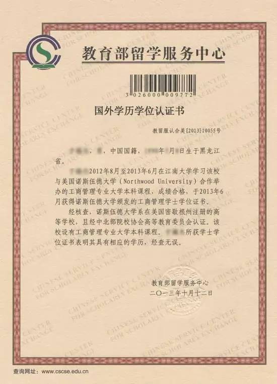 教育部认证书样本