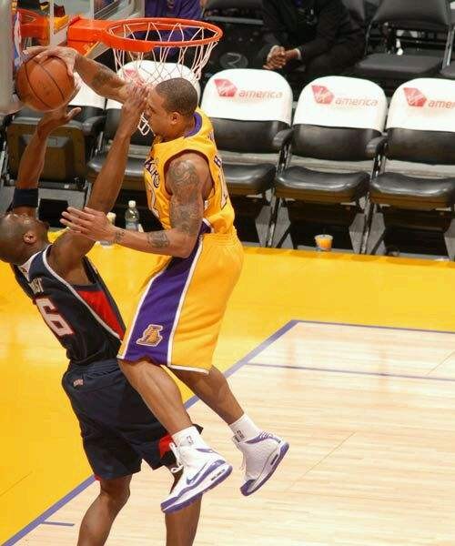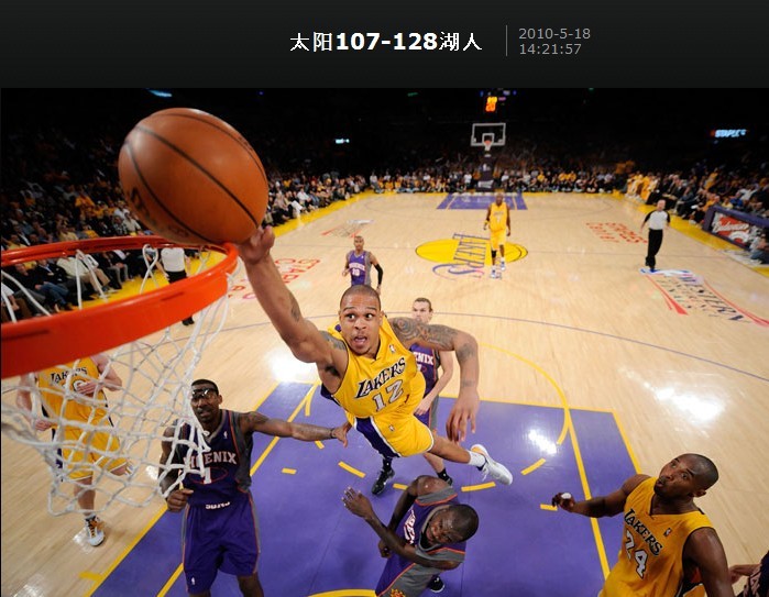 比肩2.06米队友的大手,接近玄德公比例的夸张臂展,上肢的肌肉块头“颗粒分明”,再加上傲视联盟挣脱地心引力的弹跳与爆发力,天使城的聚光灯仿佛真的比别处球馆更大更亮,紫金军团两番夺魁的赛季里,香农君“暴跳”真的“如雷”且“贯耳”。09-10赛季西决“熊熊大火”太阳碰上“洪水猛兽”湖人,首场较量,香农君便无视“扣篮王”理查德森的赫赫威名,在太岁头上松了松土,虽险些扣中,但实打实地令“四座”惨遭“技惊”。无独有偶,隔扣成瘾的香农君甚至不放过“屠戮队友”的机会。