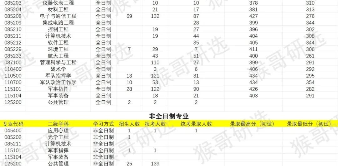 从统考录取人数来看,全日制的军事指挥、电子与通信工程、航天工程、计算机技术、软件工程、控制科学与工程专业人数均较多,属于重点招生专业,其中军事指挥人数位于榜首,录取人数为90人。此外,根据现有数据显示军事指挥、电子与通信工程专业统考录取人数均大于招生人数,有扩招迹象,考生可根据自身的情况进行选择。