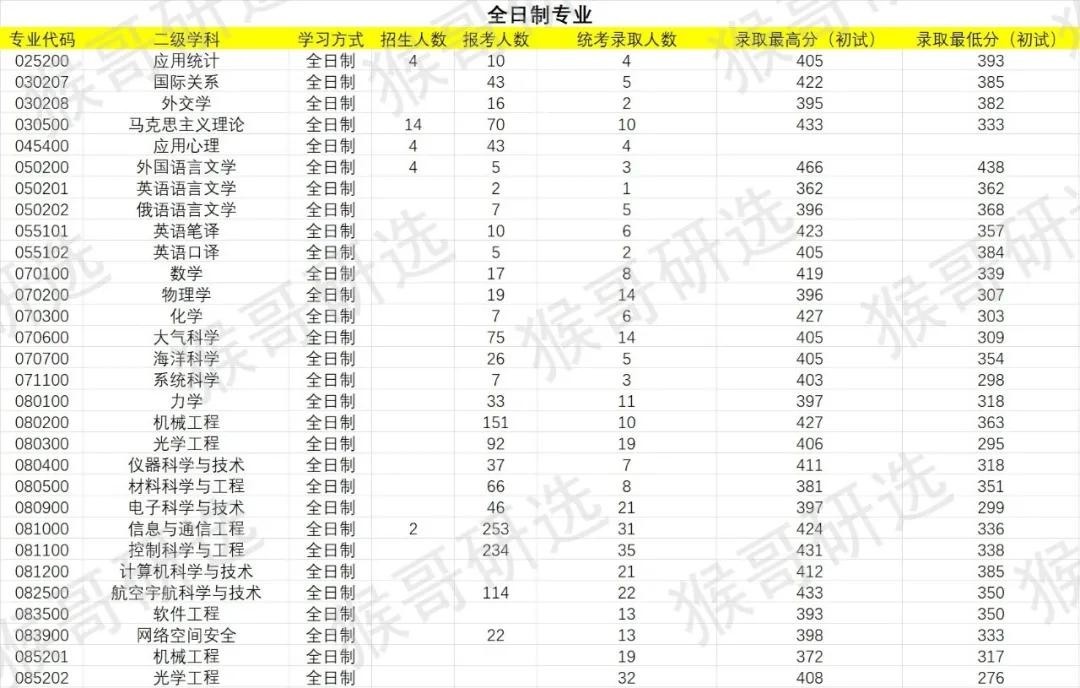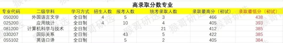 从录取线方面来看,录取线(录取最低分)最高为全日制的外国语言文学,以438分领跑其他专业,录取线排名前五的专业均高达384分以上。