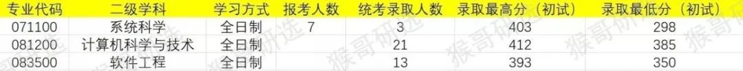 按照统考录取人数来看,系统科学专业录取人数仅为3人,软件工程录取人数13人,计算机科学与技术人数最高为21人,整体而言录取人数较低。