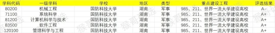 从第四轮学科评估情况来看,国防科技大学共有5个一级学科评级在A-及以上。这5个一级学科共涵盖5个二级学科。由于受到数据公开的限制,现有3个二级学科公布如下: