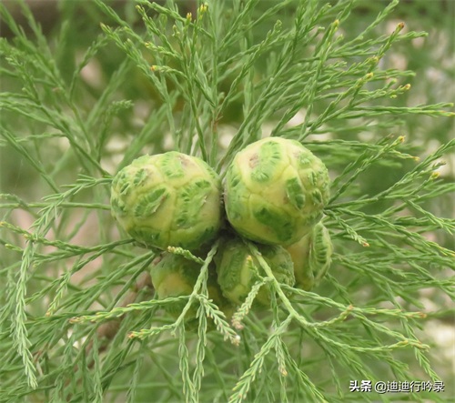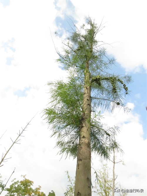 解开了物种之谜,才定下心来细看,这几棵主干笔直的大树,紧靠河边生长,树冠狭窄,直指云天,像极了一根倒挂的玉笔,挺直而不失秀美,而稀疏婆娑的树叶,再加上一串串一簇簇的果实,使整棵池杉显得那么与众不同。再次请教百度老师,才知道,原来池杉是上世纪才引进国内的树种,因其耐水涝又不惧台风的特质,大部分分布在南方,素有“不朽之木”的美誉。