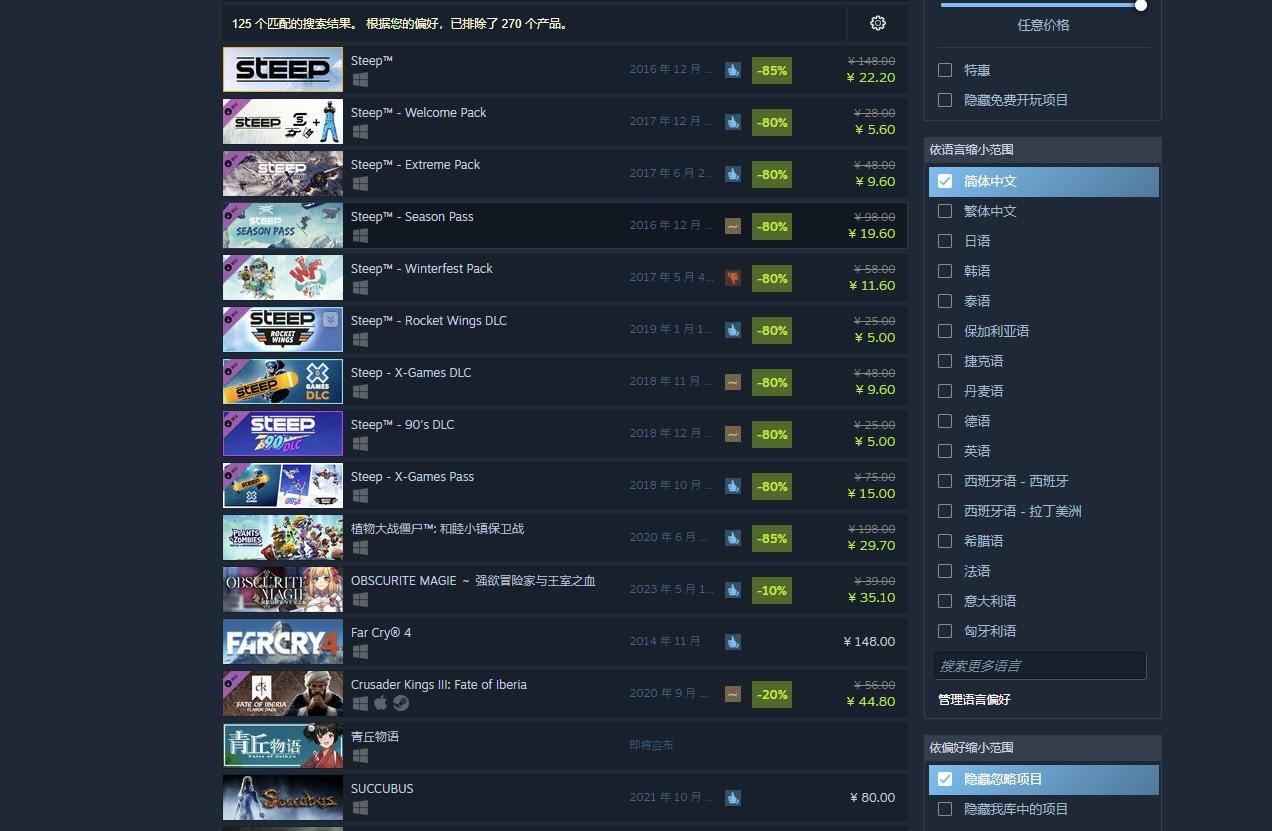 玩家们成功登陆steam后打开steam商店搜索steep就可以找到这款游戏。
