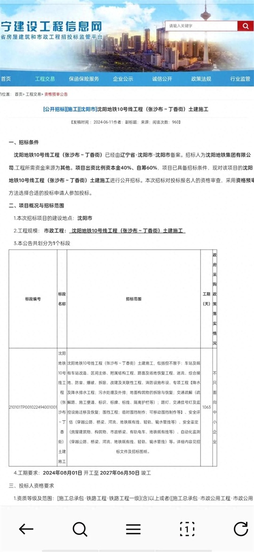 沈阳地铁十号线南段(二期)又有好消息传出,土建招标开始了。