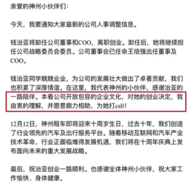 直到2017年,41岁的钱治亚正式从神州辞职创业,创立了瑞幸咖啡。对于钱治亚的创业,老板陆正耀是很支持的,他在当时还写下了一封欢送信:
