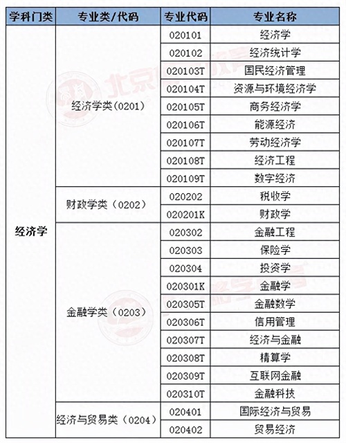 经济学类、财政学类、金融学类、经济与贸易类,每一类别下又包含具体的专业名称: