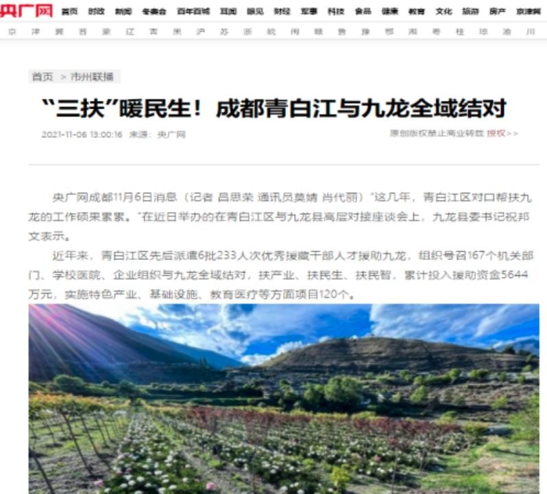 11月6日,央广网以“‘三扶’暖民生!成都青白江与九龙全域结对”为题,报道了近年来,我区持续对口帮扶九龙,先后开展助推当地特色产业发展、承办2021年大中专毕业季就业专场招聘会、探索推进“校联体”“医联体”建设工程等帮扶项目,帮扶工作成效显著等相关情况。