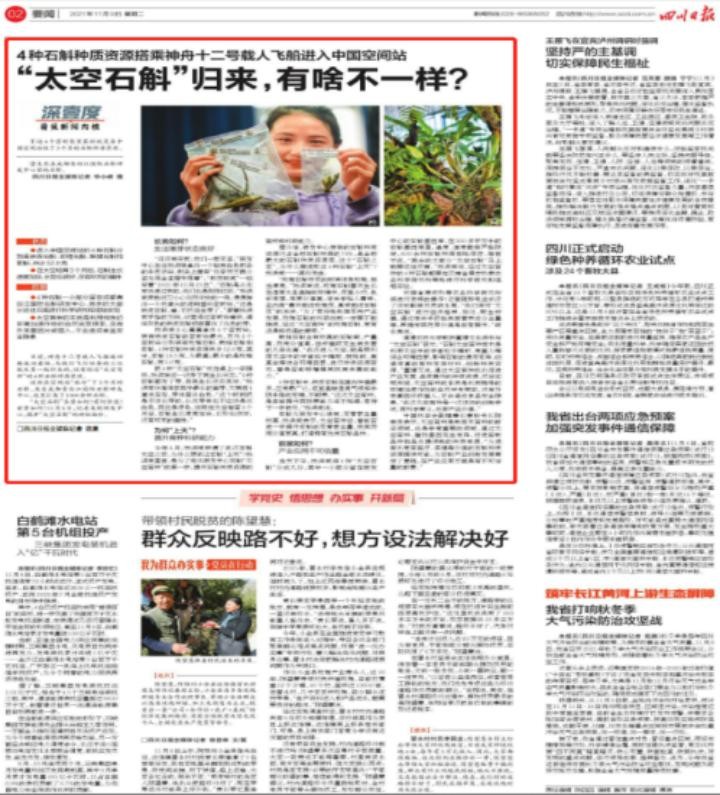 11月9日,《四川日报》02版头条(1/3版)以“‘太空石斛’归来,有啥不一样?”为题,报道了从太空归来的4种石斛种质资源现目前长势良好,并有望借此机会,提升其育种和科研能力,未来还将借助太空育种,培育出更优质的石斛品种,实现石斛产业创新发展等相关情况。