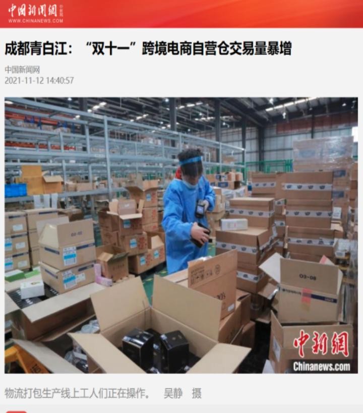 11月12日,中国新闻网以“成都青白江京东跨境电商自营仓“双11”交易突破3万单”为题,报道依托成都国际铁路港,好嗨购国际贸易(成都)有限公司、京东跨境电商自营仓等跨境电商纷纷入驻,现已实现常态化开展跨境电商1210、9610、9710业务等相关情况。