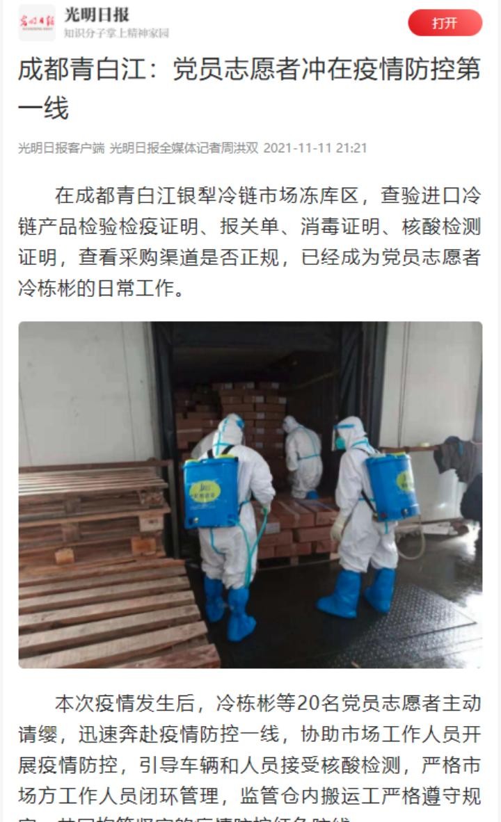 11月11日,光明日报客户端以“成都青白江:党员志愿者冲在疫情防控第一线”为题,报道银犁冷链积极组织党员志愿,奋战冷链第一线严格进行货物把关及人员管控等相关情况。
