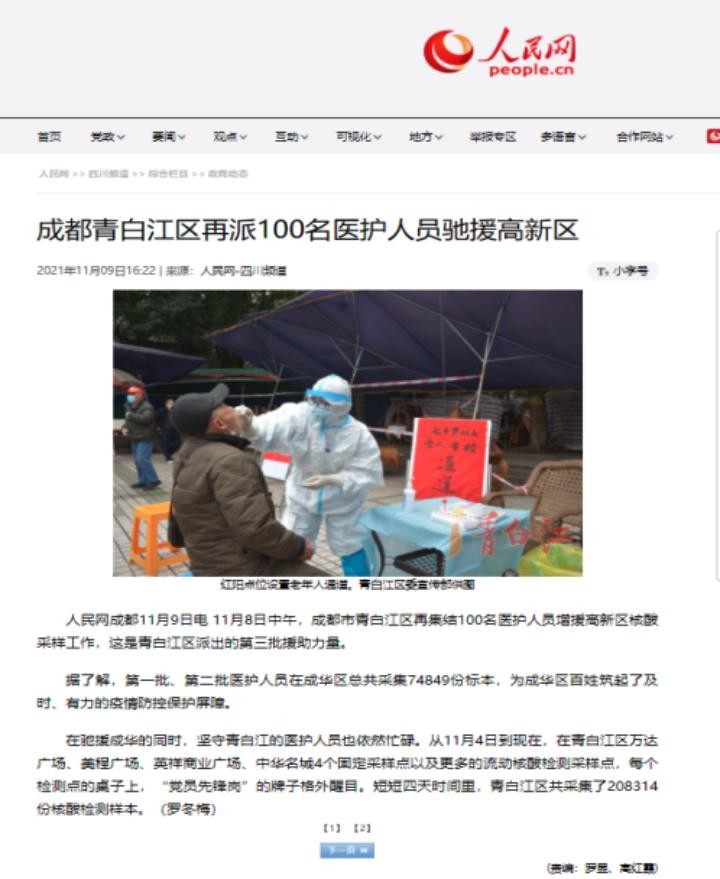 11月9日,人民网四川频道以“成都青白江区再派100名医护人员驰援高新区”为题,报道我区医护人员驰援高新区的情况。