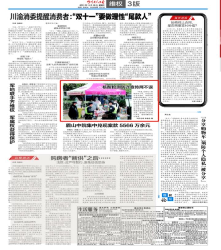 11月10日,《四川工人日报》03版以“核酸检测防诈宣传两不误”为题,报道了8日,区公安分局大弯派出所的民警们在维持核酸检测点秩序的同时,开展防诈骗和维权宣传,做到了维持秩序和开展宣传两不误等相关情况。