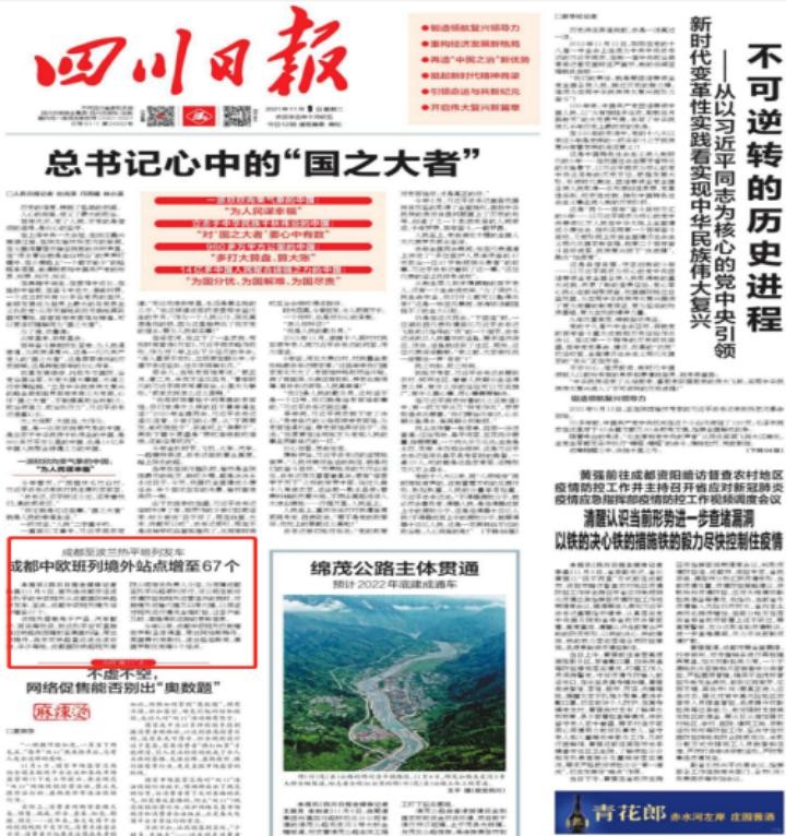 11月9日,《四川日报》01版以“成都中欧班列境外站点增至67个”为题,报道了8日,首列由成都开往波兰热平的中欧班列从成都国际铁路港发车,标志着成都中欧班列境外站点增至67个,今年共新增9个站点等相关情况。