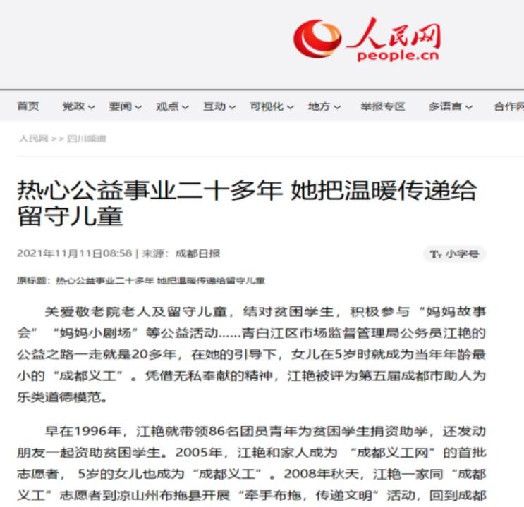 11月11日,人民网四川频道以“热心公益事业二十多年 她把温暖传递给留守儿童”为题,报道了区市场监督管理局公务员江艳20年来践行公益之路,资助贫困学生与山区儿童,并被评为第五届成都市助人为乐类道德模范等相关情况。