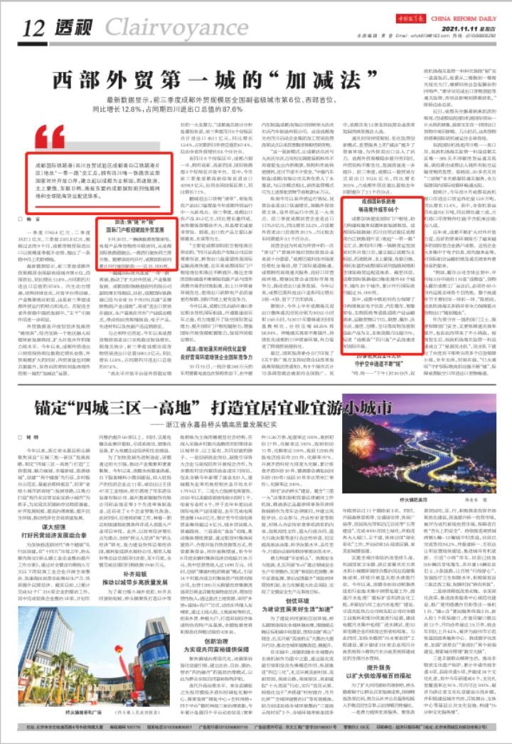 11月11日,《中国改革报》第12版头条在“西部外贸第一城的‘加减法’”一文中,重点报道了成都中欧班列联通境外站点66个,连接“一带一路”两端,拉动了对外贸易的持续增长,为成都加快建设国际门户枢纽,构建和服务双循环新发展格局做出巨大贡献等相关情况。