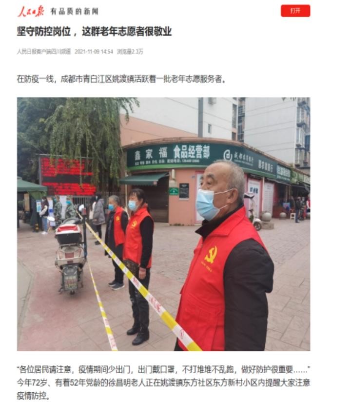 11月9日,人民日报客户端四川频道以“坚守防控岗位 ,这群老年志愿者很敬业”为题,报道姚渡镇的老年志愿服务者主动要求参与到防控工作的情况。