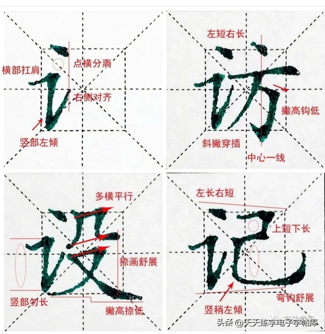1.今:撇捺一定要舒展,并且当撇捺在上方时口诀记起来,撇捺在上撇低捺高,中间撇捺的交叉点,点画,撇画的最后收笔处三点共用一线。