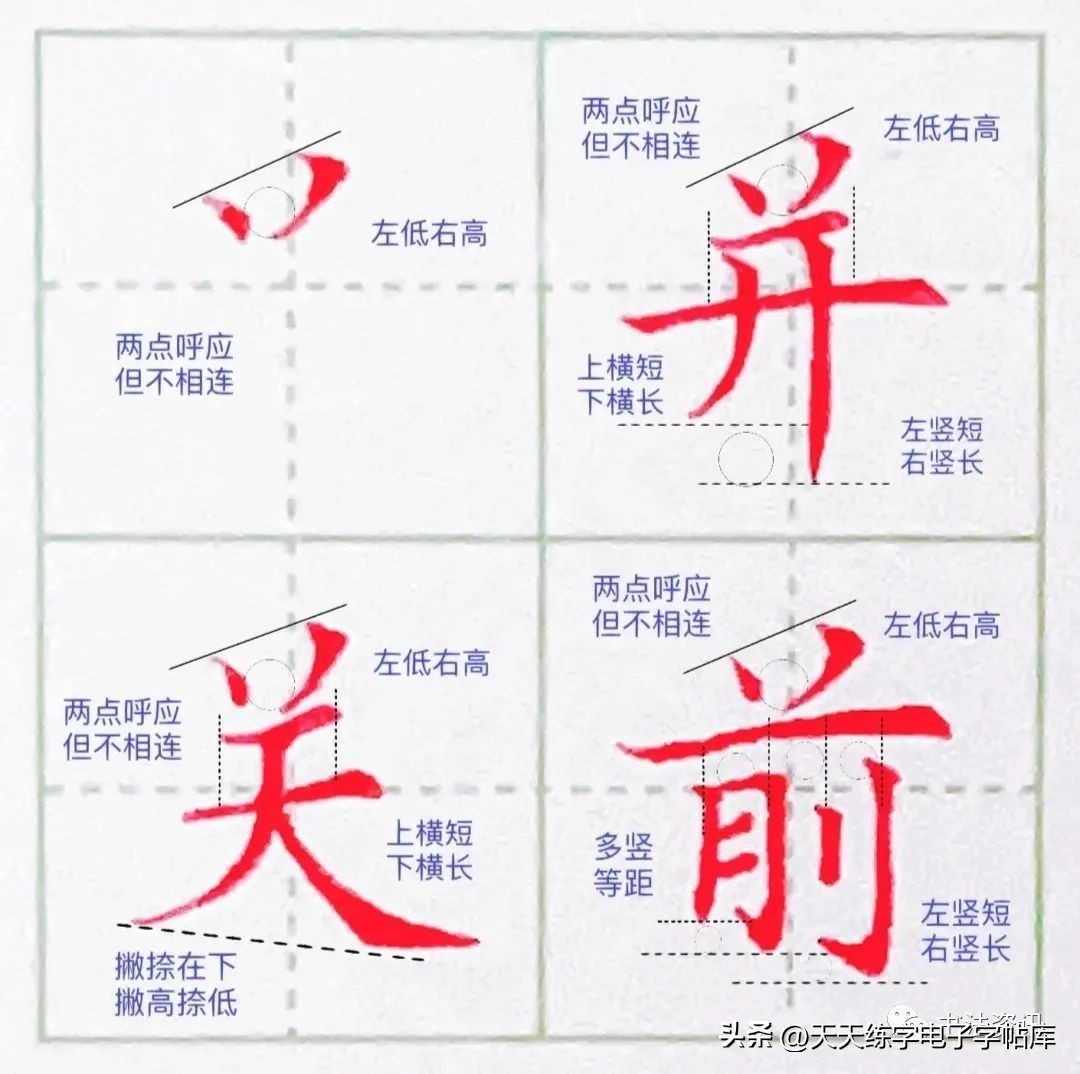 2.并:上方两点相呼应但是决不相连接,并且呈现左低右高姿态,上橫短, 下横长,斜度保持平行,也要被竖中线左右平分,左侧竖撇先竖在撇,撇靠上,最后一笔悬针竖画垂直向下突出主笔伸展。一高一低