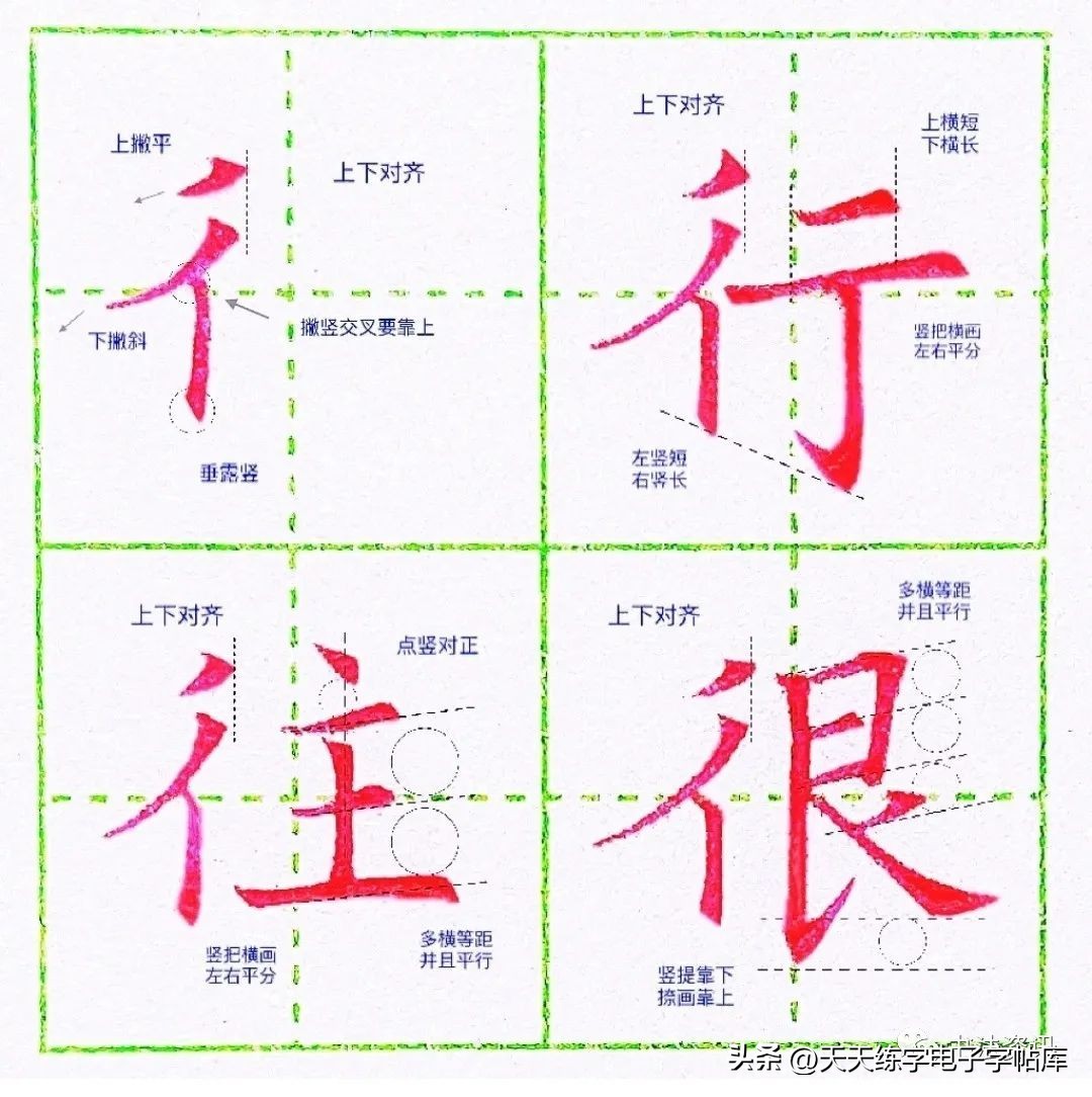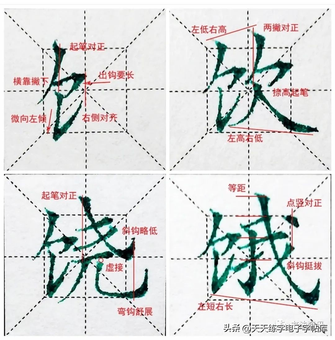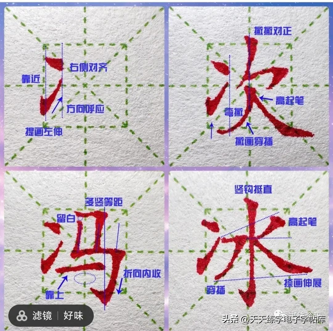 2.上下两撇起笔位置可保持一致,或者下方撇画要靠里。