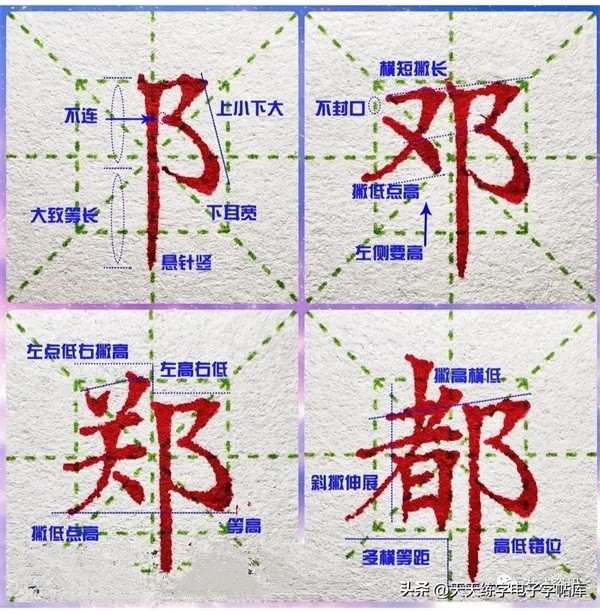 2、外参差:上下偏旁的纵向笔画外段,一般 左边笔画锁进右边笔画伸出;左右偏旁的横向笔画外端,一般上边笔画缩进下边笔画伸出,参差错落。