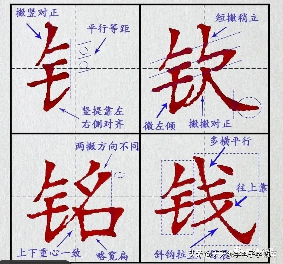 金字旁:首撇为斜撇,不宜过长。三橫等距,抗肩。竖略偏左,提画写长。整个字形上紧下松,右紧左松。