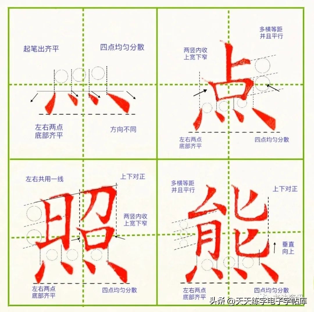 3.照:上下结构,上紧下松,日字当中横画左连右不连,下方四点均匀分散,方向不同,但是间距控制均等第一个点画和最后一个点画最下面底部齐平。