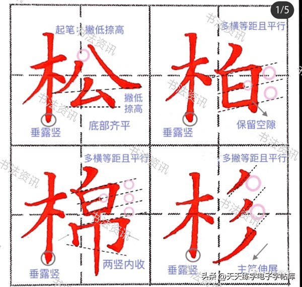 4.杆:左右结构,左窄右宽,左高右低都是他所呈现出来的表现形式,木字旁我们之前有讲过系统大家可以返回去看看,右侧干字当中上横短,下横长对比要明显斜度也要平行,中间这里的竖我们采用的是悬针竖画,悬针竖画垂直向下把每一个横画左右平分,两侧有竖要有所区分,左竖短右竖拉长对比明显。