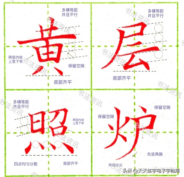 1.黄:首先横画较多我们一定要注意到多横等距并且平行,田字当中两侧竖画同时向里倾斜,中间的小短横左右不连,留白透风。其次注意底部的两点均匀分散保持齐平。