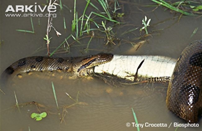 黄水蚺,英文名yellow anaconda,学名Eunectes notaeus。这种大蛇分布于南美洲的北部,包括巴拉圭,玻利维亚,巴西和阿根廷的北部。相对于大姐绿水蚺,黄水蚺这个妹妹的体型要的多成年黄水蚺体长2.4-4.6米,一般重30公斤,最大可达40公斤;但是黄水蚺雄蛇最大体长可达3.7米,比绿水蚺的雄性要大。黄水蚺背面的鳞片呈黄绿色,布满黑色的斑纹和互相重叠的斑点。和绿水蚺一样,黄水蚺也是一种半水栖,夜行性的大蛇,同样潜伏在水中用伏击的方式捕猎,并用粗壮且肌肉发达的身体缠绕绞杀猎物。黄水蚺的食物包括鱼,蜥蜴,龟,凯门鳄,水鸟,墨西哥鹿,水豚和西猯,有时也吞食腐肉,水鸟在其食物中占的比例是最大的。值得一提的是,如果按照掠食者自身与猎物体型的比例计算的话,黄水蚺的猎物比绿水蚺的要大得多。和绿水蚺一样,黄水蚺也在4-5月开始繁殖,雌蚺经过6个月的怀孕期,一胎能生下4-82条,通常40条幼蛇;初生的幼蛇有50%会被凯门鳄,食蟹狐,双领蜥(也就是通常说的泰加蜥,属于美洲蜥科)甚至更大的同类吃掉。如果幼蛇成功活到了成年的话,在野外它们能生存15-20年,圈养的最高寿命是23年。