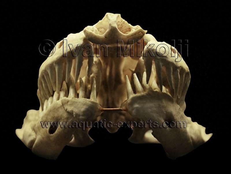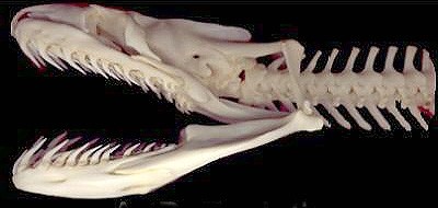 绿水蚺的头骨,可以清楚的看到锋利的牙齿和分成两块的下颌骨