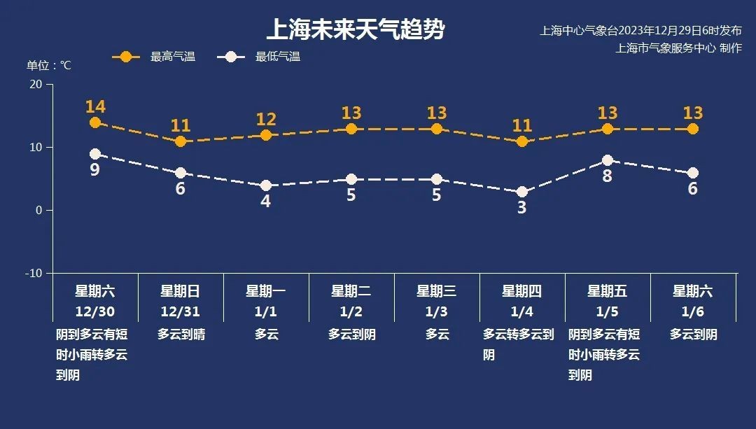“先雨后晴、适宜出行”是元旦假期的概况,但假期期间气温还将有所波动,市民朋友们还需根据气温变化灵活穿衣。上海中心气象台预计,假期首日白天短时小雨,夜里弱冷空气开始影响本市,风力有所增大。值得注意的是,30日到1月1日的跨年48小时内,最低气温降幅预计为4~6℃,气温明显下降,市民朋友们户外跨年务必注意保暖。